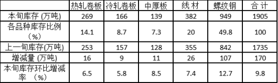 2月下旬,20个城市5大品种钢材社会库存1905万吨,比上一旬增加170万吨,增长9.8%,增幅有所回落;比1月增加1093万吨,增长134.6%;比去年12月增加1223万吨,增长179.3%。