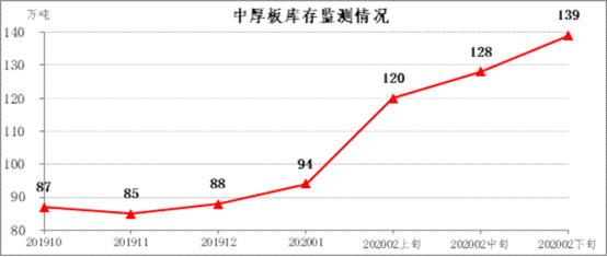 2月下旬,中厚板库存139万吨,比上一旬增加11万吨,增长8.5%;比1月增加45万吨,增长47.9%;比去年12月增加51万吨,增长58.0%。
