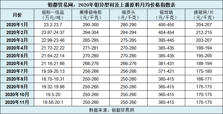 下一篇:钼都贸易网:2020年钼酸铵、高纯三氧化钼及上游原料月均价格指数表(1-11月份)