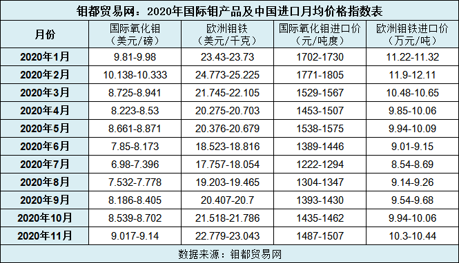 下一篇:钼都贸易网:2020年中国钼铁及上游原料月均价格指数表(1-11月份)